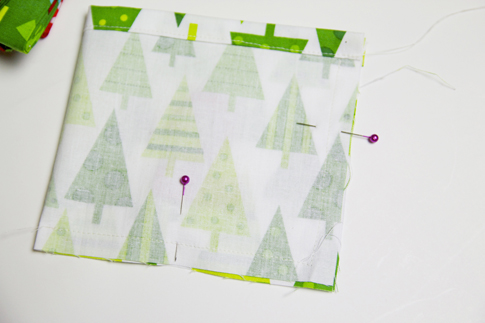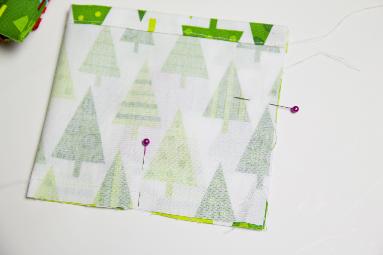 Beginning with your first piece of fabric, fold down the top long raw edge a 1/2″ and press. Fold over again a 1/2″ and press again.