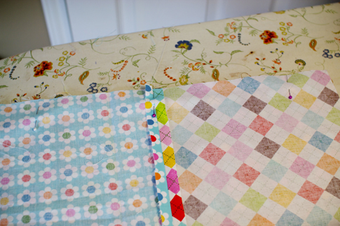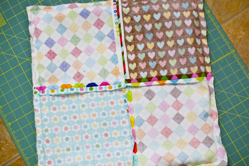 Once your tassel is in place, you are almost done! Lay the front patchwork panel on top of the back panel (right sides together) matching up all 4 sides. Pin in place leaving about a 6″-7″ opening at the bottom of the pillowcase for flipping and stuffing. Sew all around (except for the opening) with a 1/2″ seam allowance, making sure to backstitch at each end.