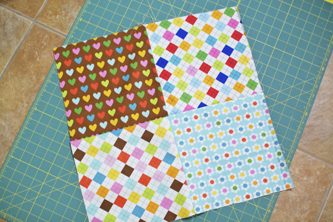 For the front, place two 10″ x 10″ pieces on top of each other right sides together and sew a 1/2″ seam down one side. (If your print is a directional print, make sure you pay attention to which way your fabric is facing, so it will be correct once the pillow is finished) Do the same to the other two 10″ x 10″ pieces. Iron the seams open.