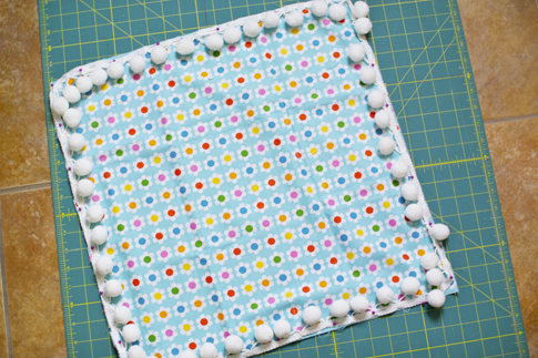Take your pom pom tassel and pin it around all 4 sides of the back panel. Make sure you pin it with the pom poms facing in. Sew or baste the tassel in place using a 1/4″ seam allowance, making sure to back stitch at each end. I like to do this so when you sew the two panels together, you don’t have to worry too much about the tassel moving around.