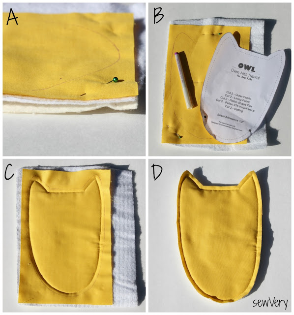 View of the Owl Oven Mitt front from the wrong side. Note how the batting and insulation are trimmed from the seam allowance (C).