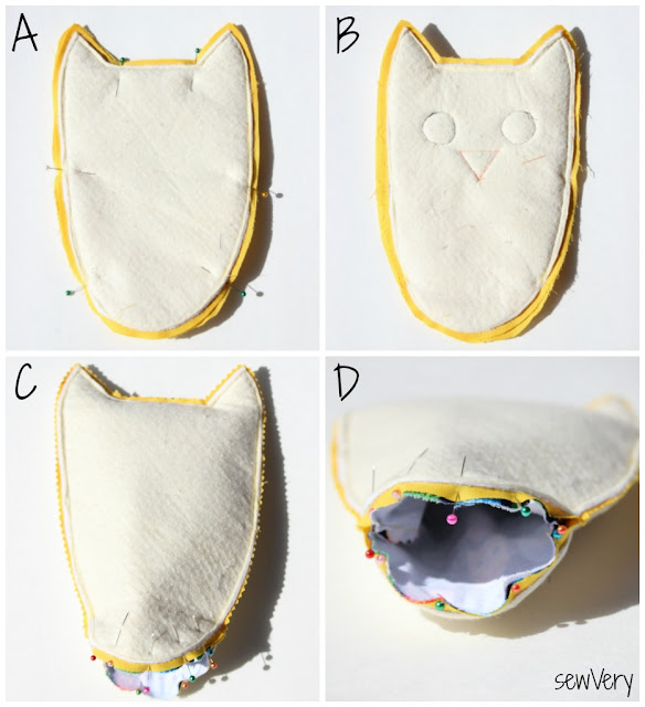 Trim the sewn edges using pinking shears, and clip the corners where the top of the owl head and ears meet. Insert the Lining between the two Outer pieces so that right sides of the Lining and Outer pieces are together (C).