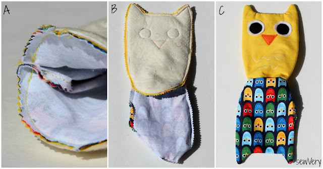 Trim the sewn edges using pinking shears, and clip the corners where the top of the owl head and ears meet. Insert the Lining between the two Outer pieces so that right sides of the Lining and Outer pieces are together (C).